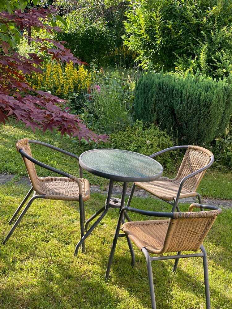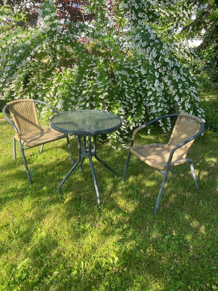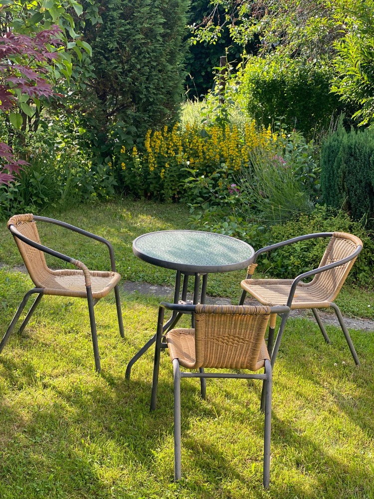 Venkovní posezení, gril s připraveným dřevem a oáza klidu uprostřed města.